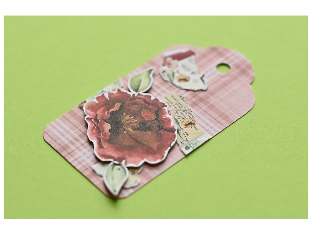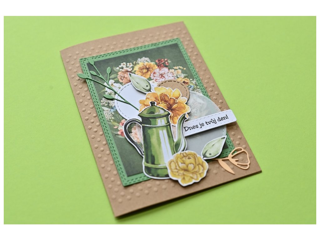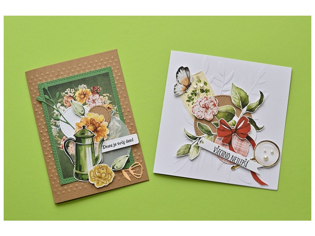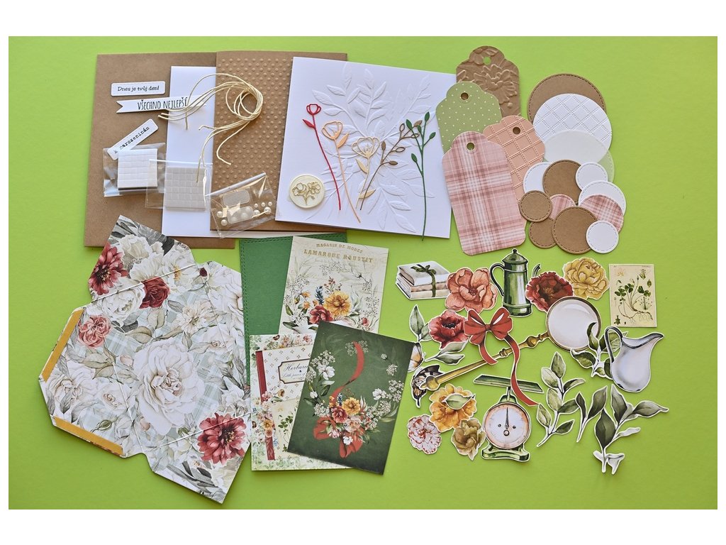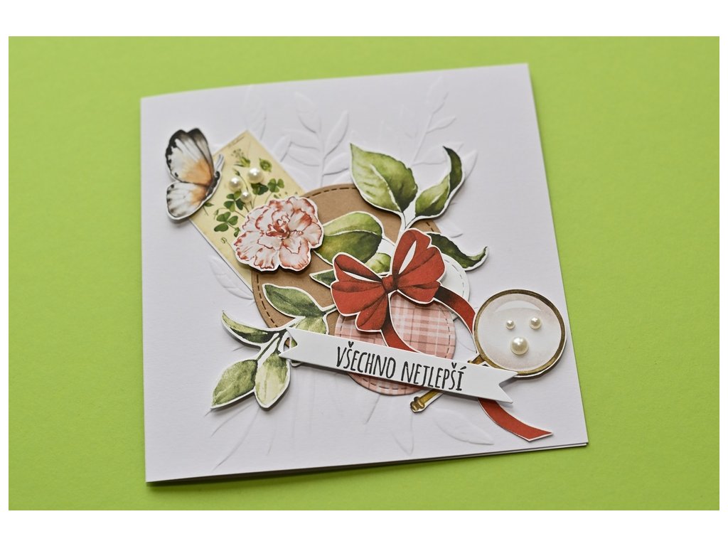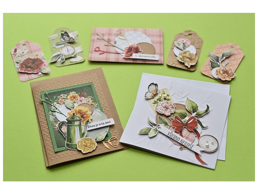 Tato kreativní sada je laděná do zelených a růžových odstínů, které jsou kombinované s botanickými motivy, převážně květin a lístků. Z jedné sady si vytvoříte hned několik krásných papírových předmětů: dvě přáníčka, čtyři jmenovky na dárky a jednu malou dárkovou obálku do které lze vložit například dárkovou kartu nebo peníze.