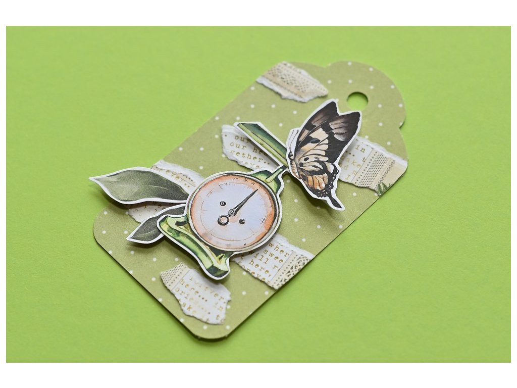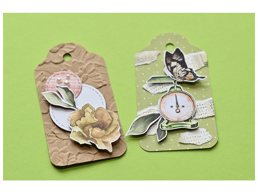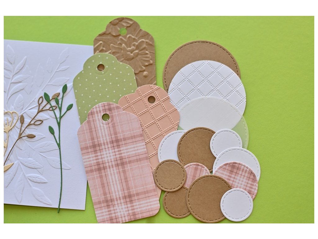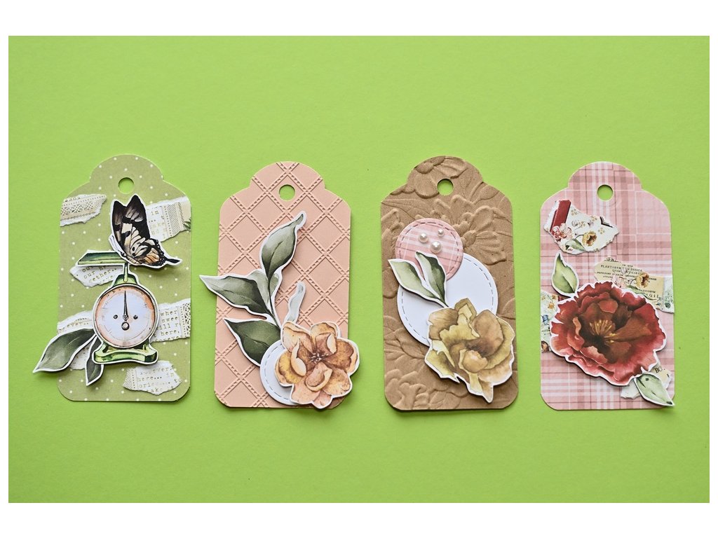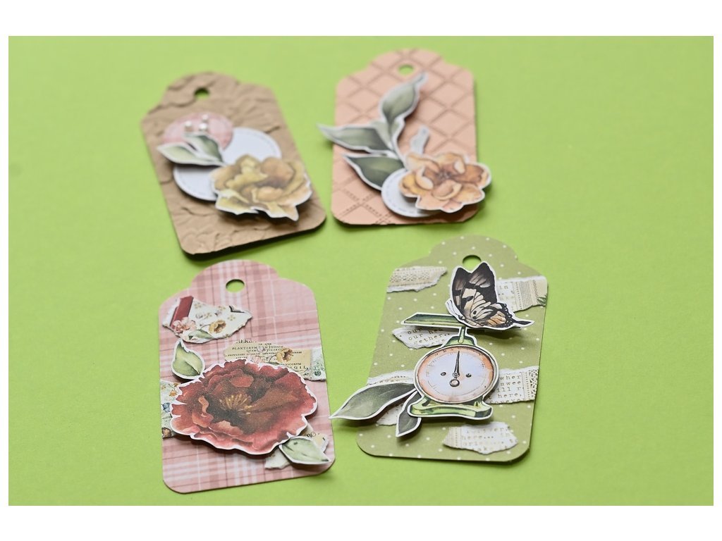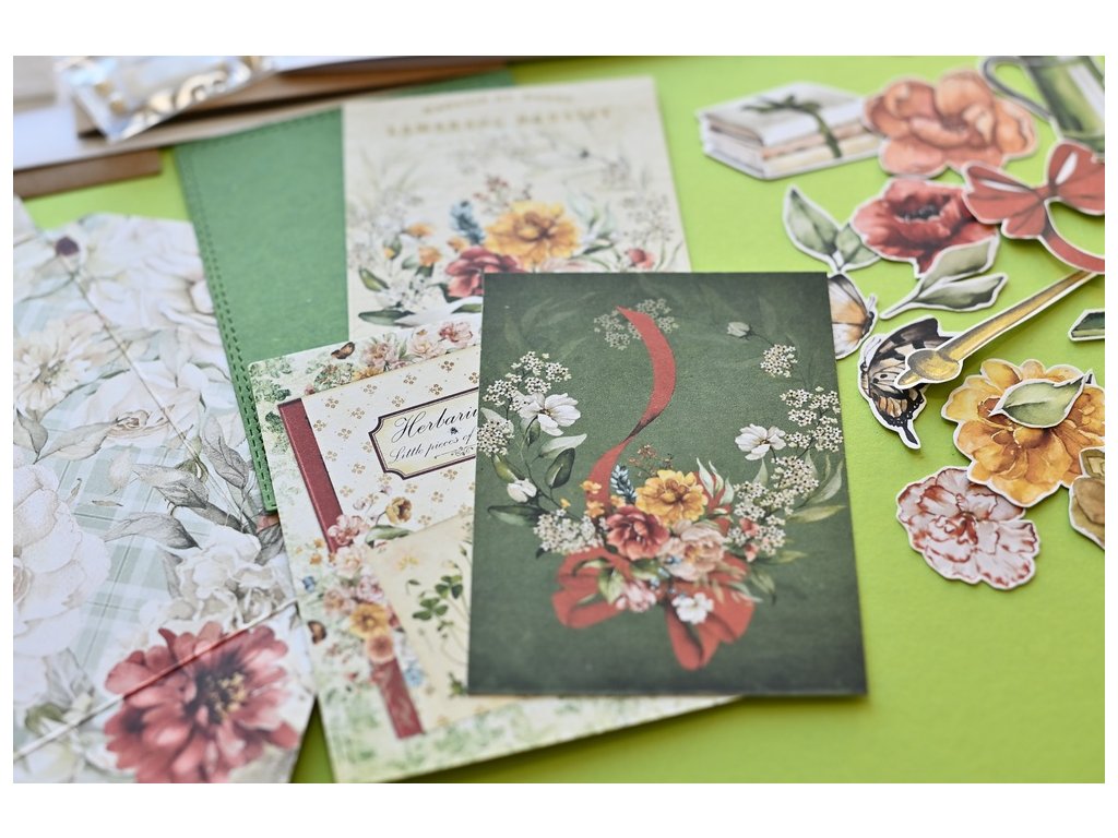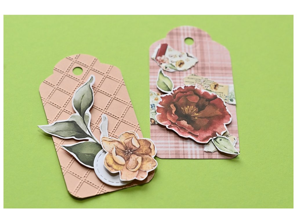 Tato kreativní sada je laděná do zelených a růžových odstínů, které jsou kombinované s botanickými motivy, převážně květin a lístků. Z jedné sady si vytvoříte hned několik krásných papírových předmětů: dvě přáníčka, čtyři jmenovky na dárky a jednu malou dárkovou obálku do které lze vložit například dárkovou kartu nebo peníze.
