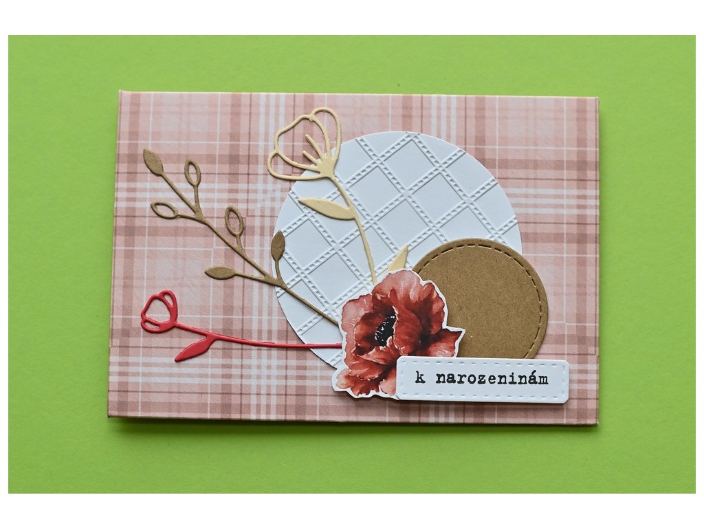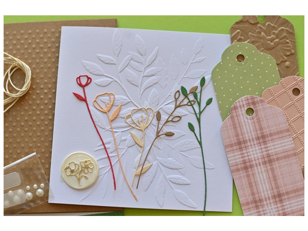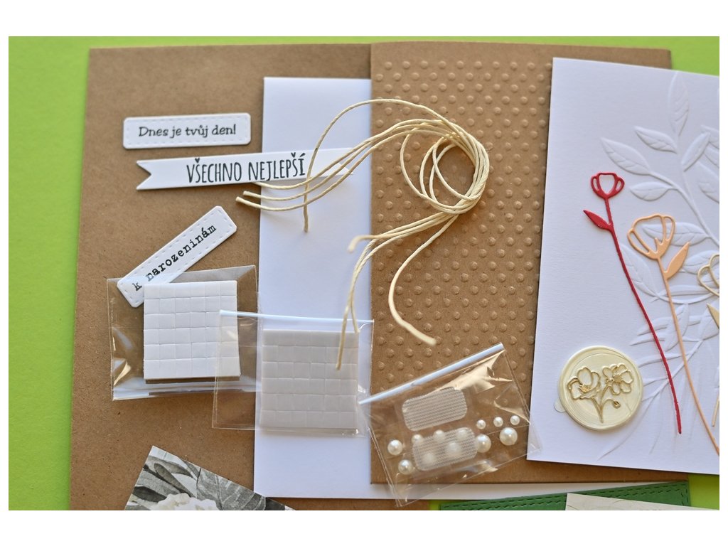 Sada na výrobu 2 přáníček, 4 jmenovek a 1 dárkové obálky s motivy květin.