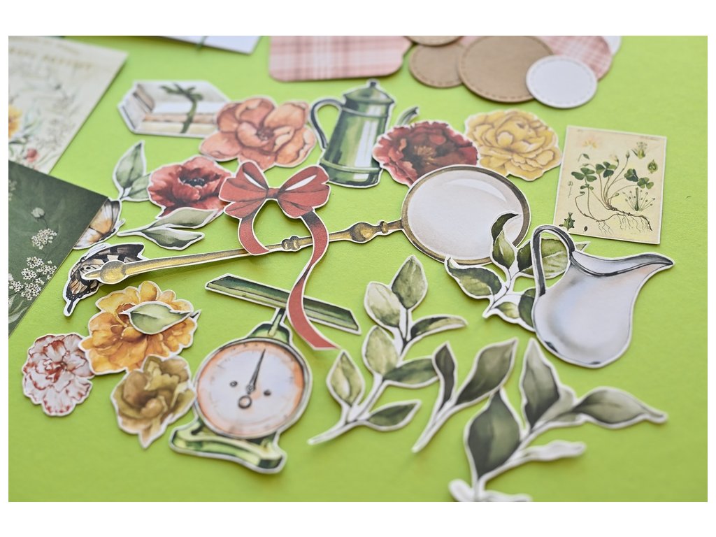 Sada obsahuje běžné prvky jako embosované korpusy, botanické výstřižky, 3D polštářky, nápisy nebo šňůrky na jmenovky. Navíc v ní ale také naleznete lepící perličky, suchý zip a voskovou pečeť. Jediné co budete k sadě potřebovat je lepidlo a kreativní náladu.