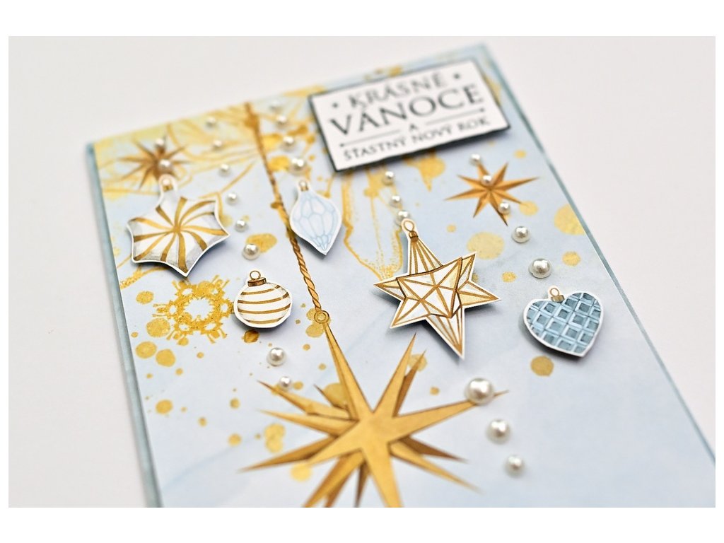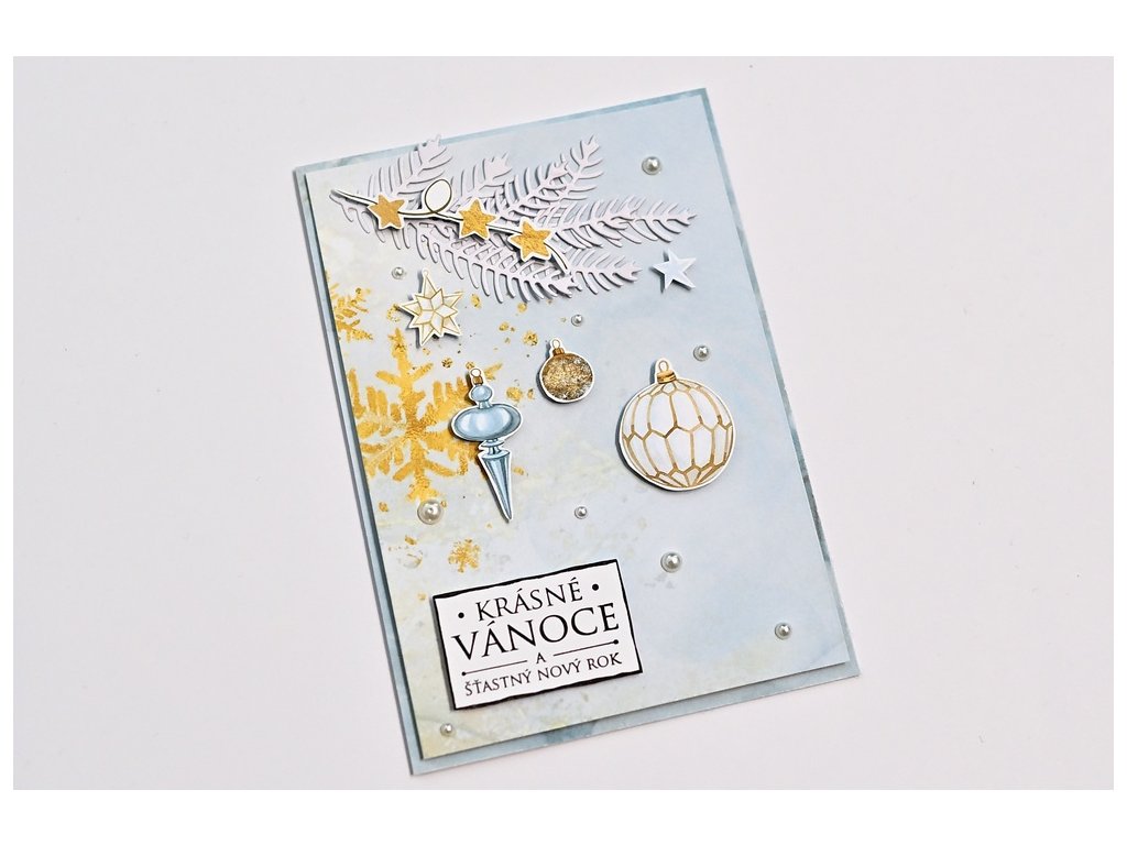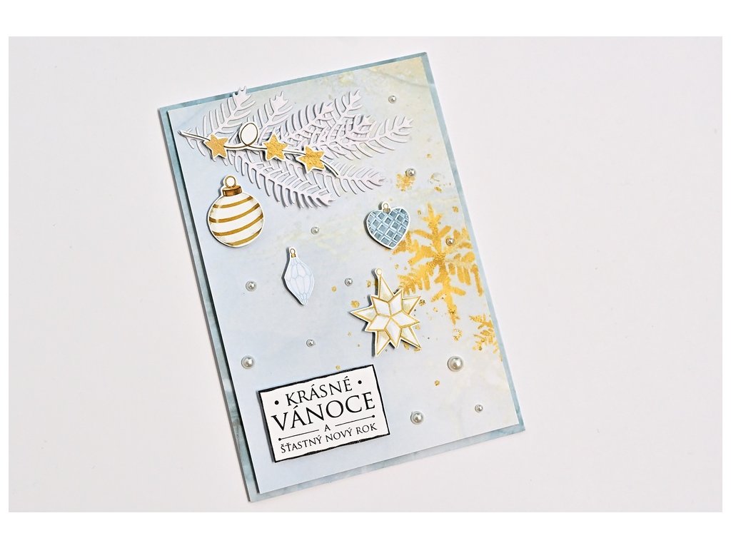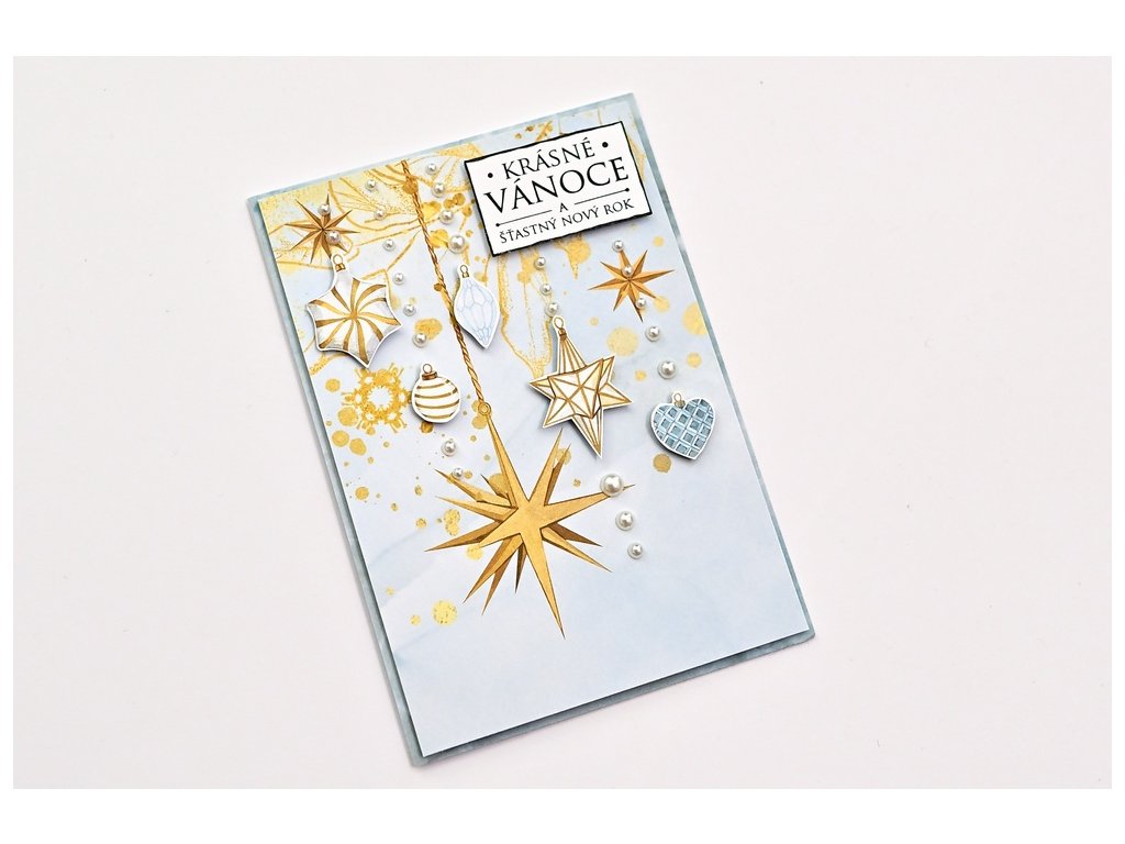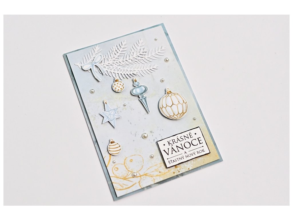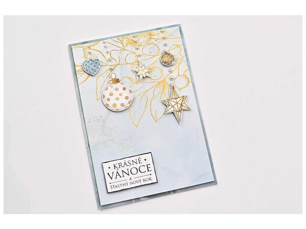 Vánoční přáníčko laděné do modra, s ozdobičkami a perličkami. Pět variant na výběr.