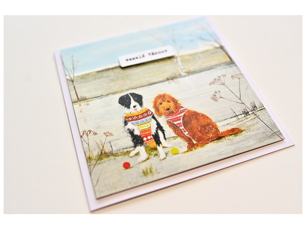 Vánoční přáníčko s pejsky v zasněžené krajině.
