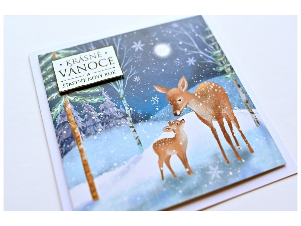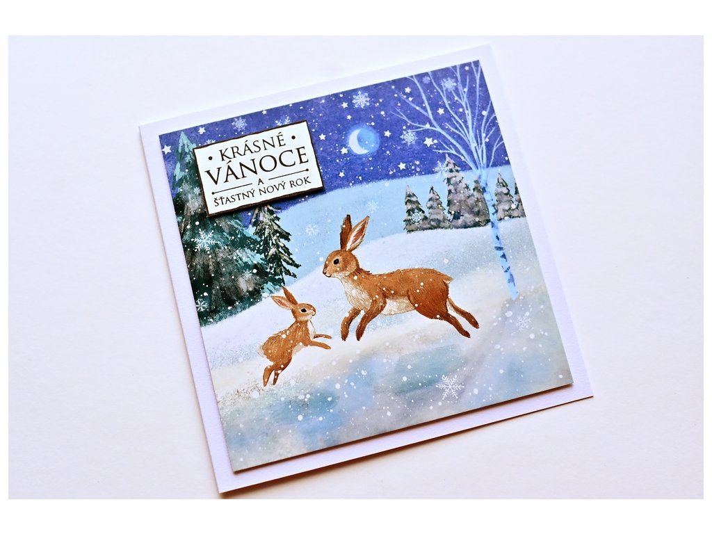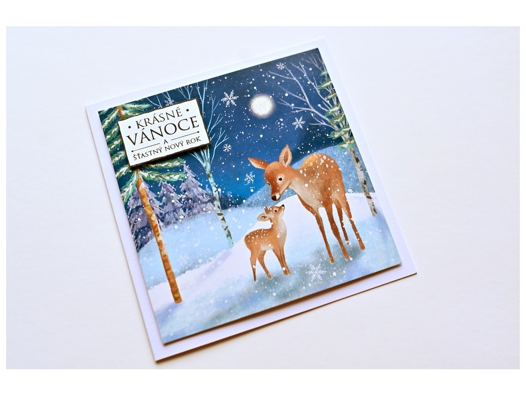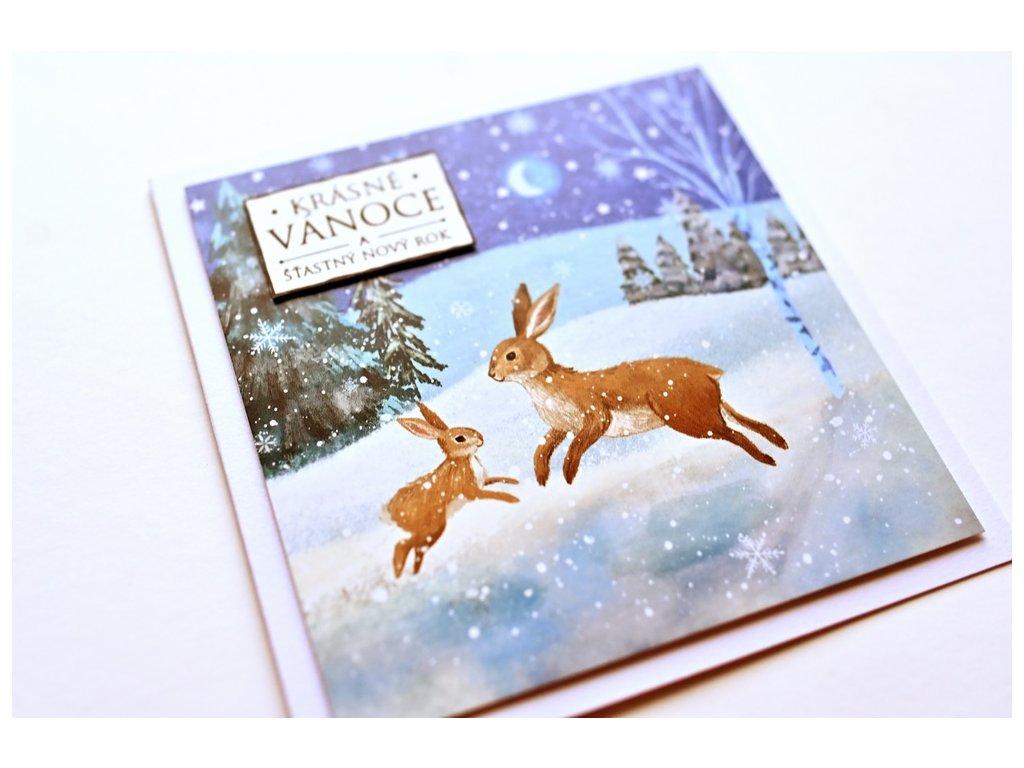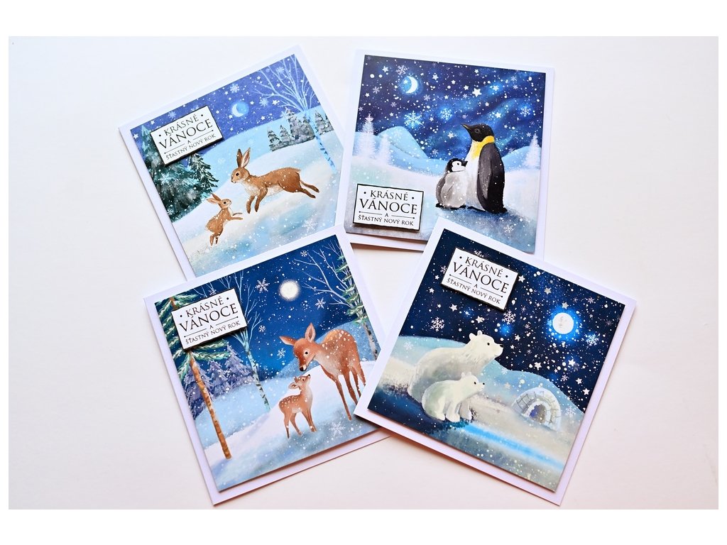 Zimní vánoční přáníčka laděná do modré, se zvířátky v přírodě. Čtyři varianty přáníček.